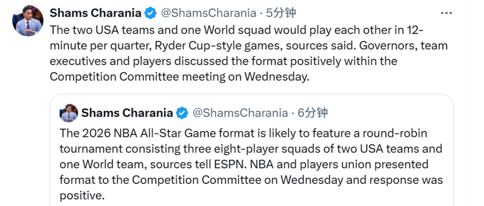 北京时间9月4日,据ESPN名记Shams报道,2026年NBA全明星赛赛制可能采用循环赛形式,由两支美国队和一支世界队组成,每队8名球员。消息人士称,NBA和球员工会已于当地时间周三向竞赛委员会提交了该赛制,得到了积极回应。消息人士还表示,两支美国队和一支世界队将进行类似莱德杯赛制的比赛,每节比赛12分钟。球队老板、球队高管和球员在竞赛委员会会议上对该赛制...
