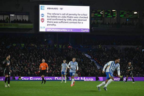 下半场易边再战,布莱顿开始逐渐占据主动。第59分钟,萨利巴和若昂·佩德罗在禁区内的争抢中头部相撞,主裁判安东尼·泰勒认为佩德罗在相撞前掌握球权,因此判罚点球。后者亲自在12码操刀命中,将比分扳平。现场的视频裁判组(VAR)随即在场内大屏幕上发布了复核结论:“萨利巴对佩德罗的犯规已经经过VAR的复核检查,两人之间有足够充分的身体接触可以判罚点球。”